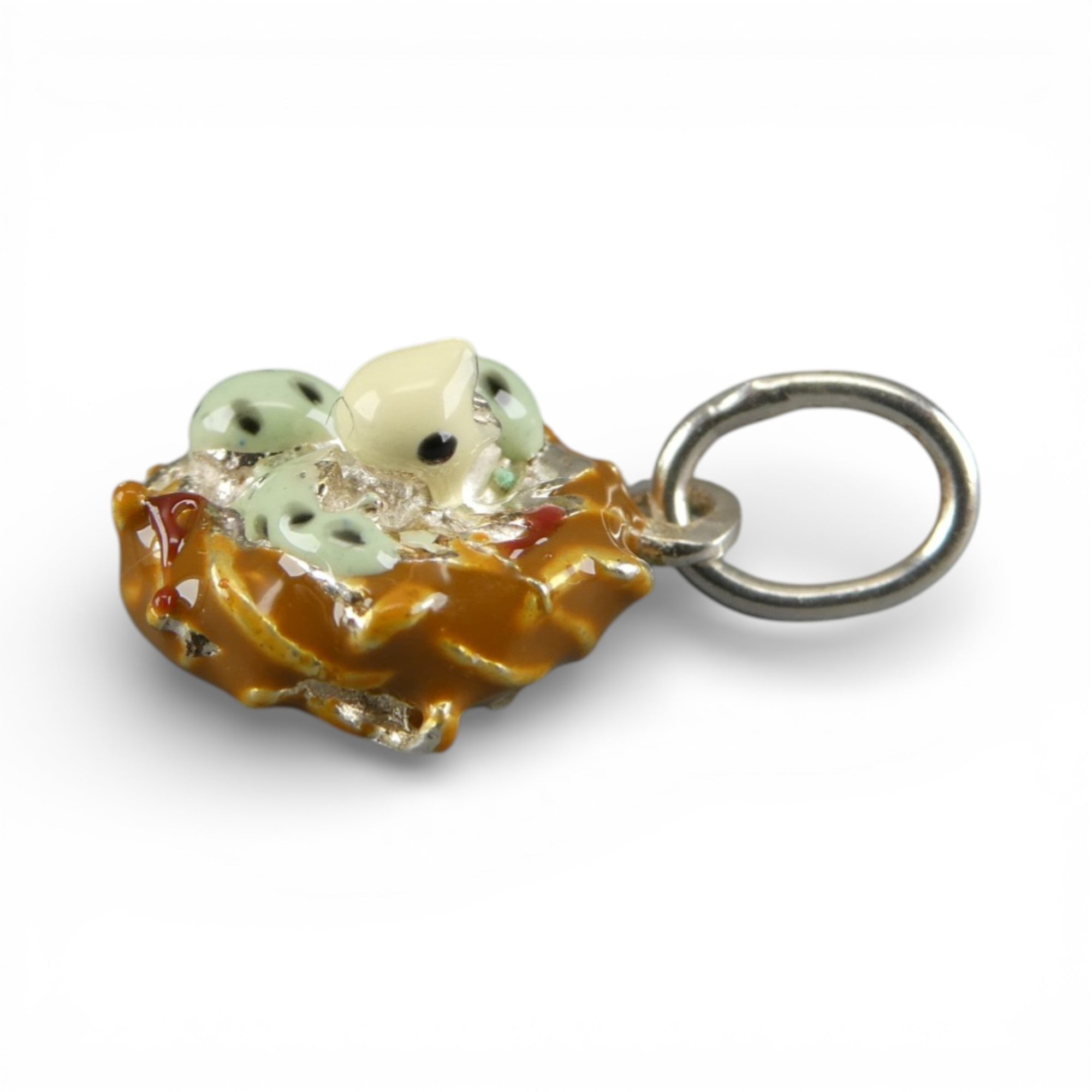 This three-dimensional, sterling silver, hand-enameled Bird Nest charm features a brown nest, two unhatched eggs, and a baby bird with its beak agape, crying out for food. Made by Brown County Silver in the 1990s. Vintage but new condition.