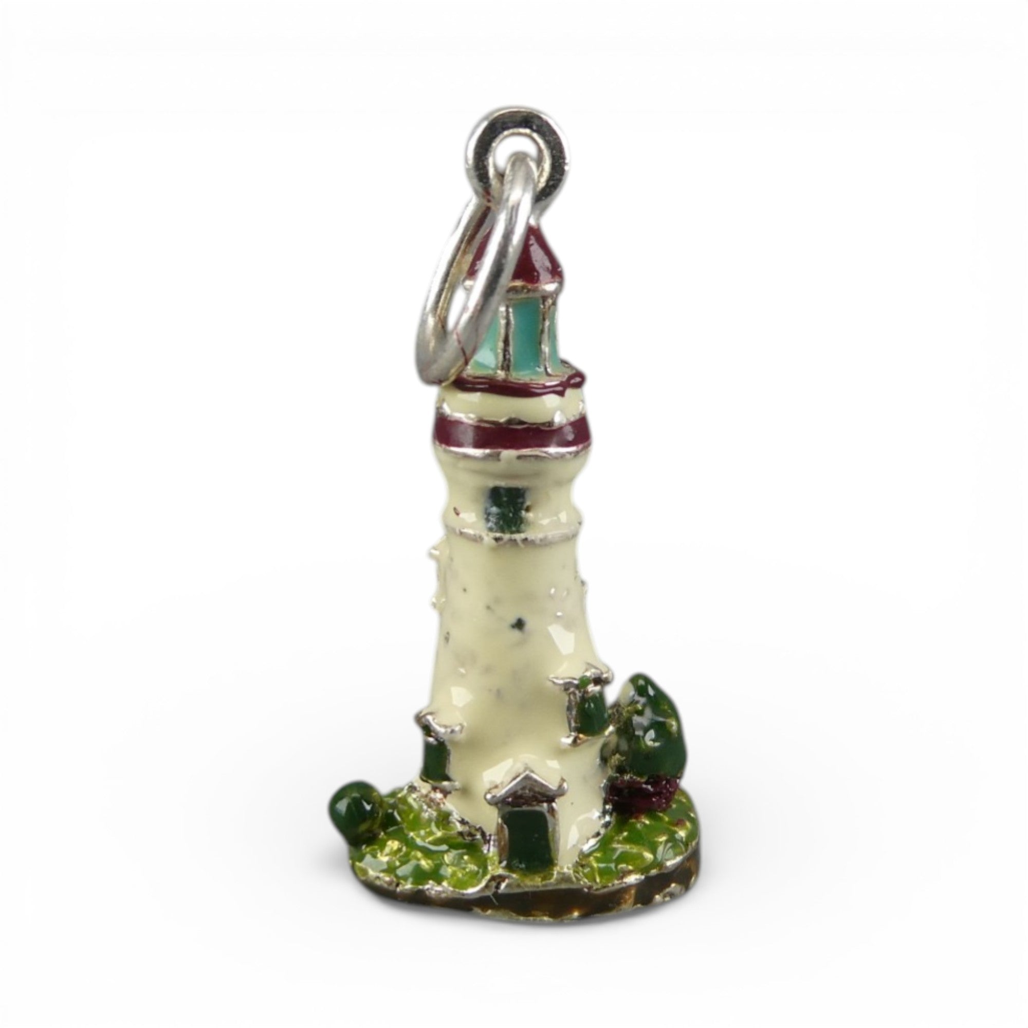 This three-dimensional, sterling silver Lighthouse charm is hand-enameled in white, brown and silver with blue and green windows. It is nestled in green foliage.