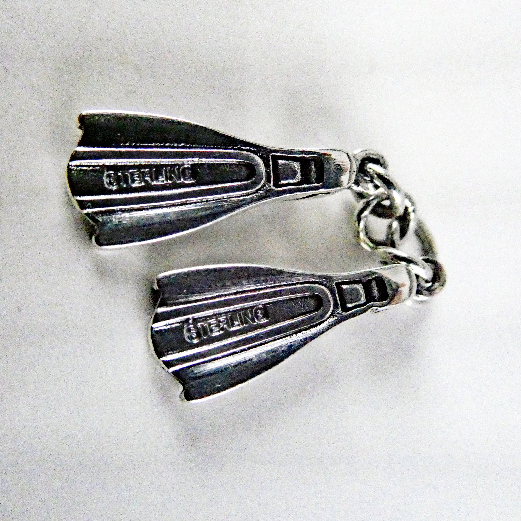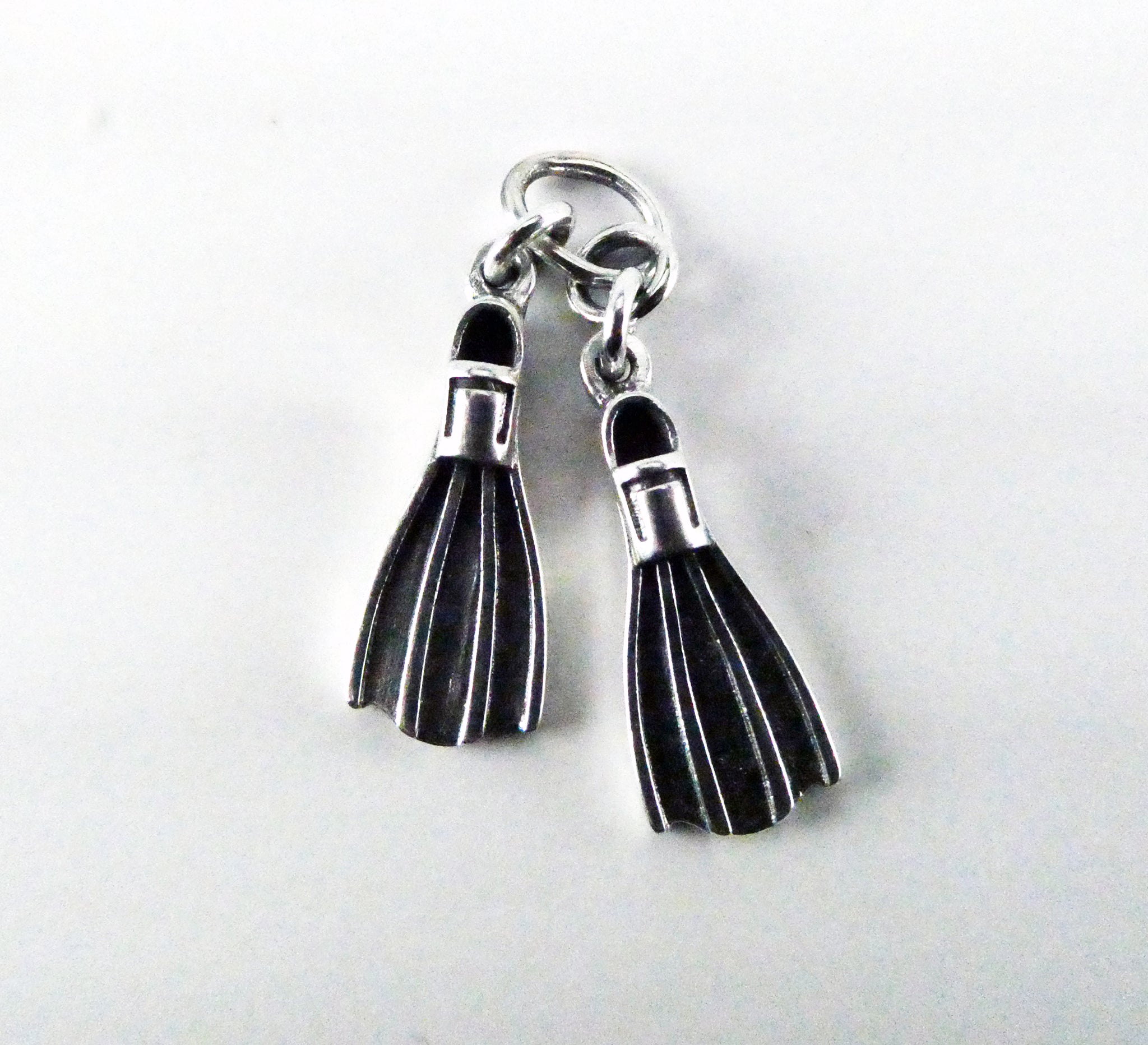 This three-dimensional, antiqued sterling silver Swim Fins charm features a pair of deeply-ribbed swim fins bound together with a sterling silver chain. Made by Brown County Silver. Vintage but in brand new, never worn condition.