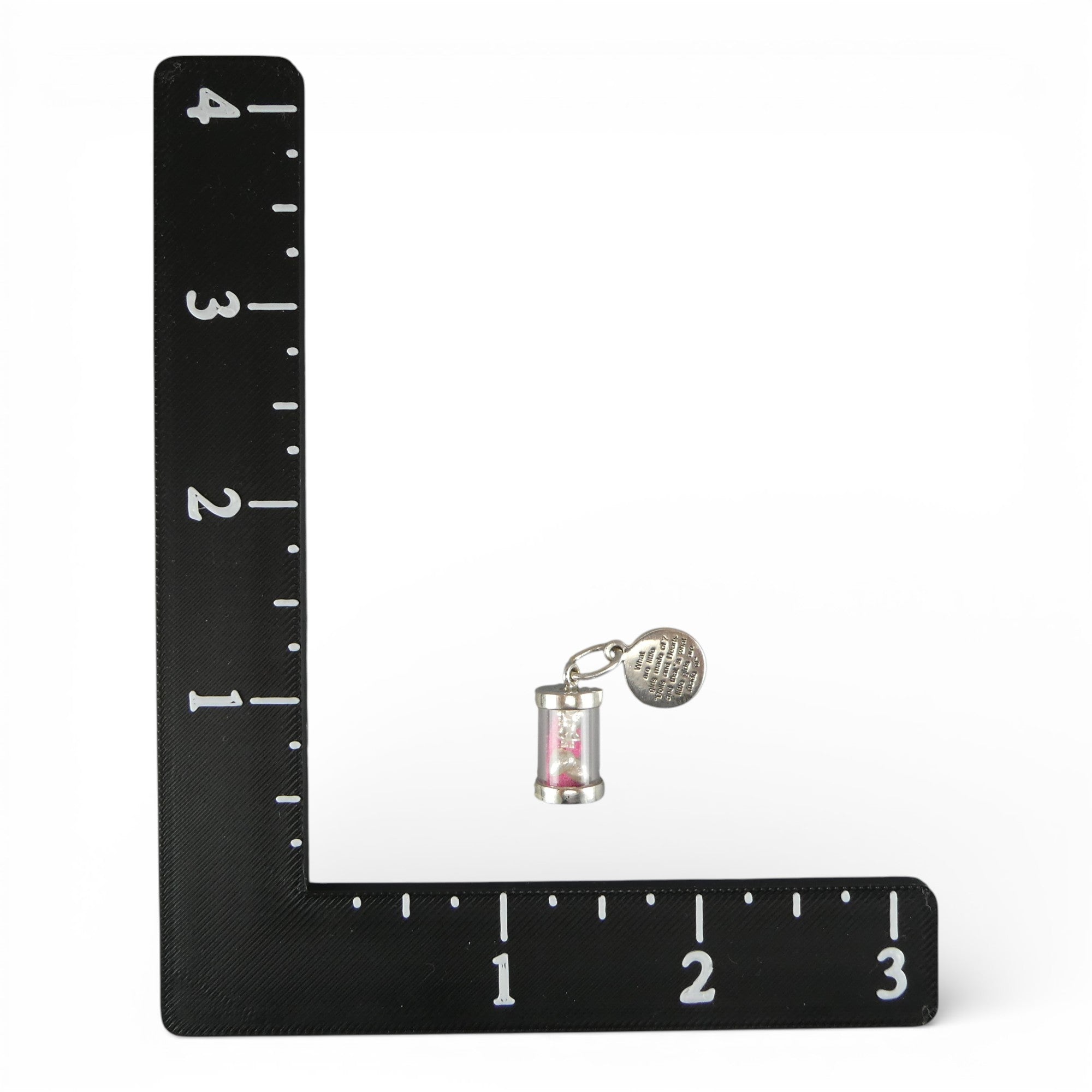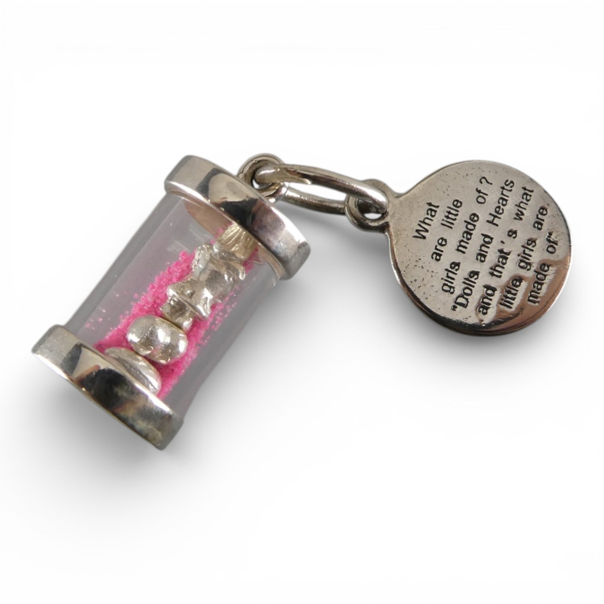 A three-dimensional, sterling silver What Are Little Girls Made Of? charm featuring an acrylic tube filled with pink sand, a tiny silver doll and two equally tiny silver hearts.The attached silver pendant reads "What are little girls made of? Dolls and Hearts and that's what little girls are made of". Made by Brown County Silver. New old stock. Never worn.