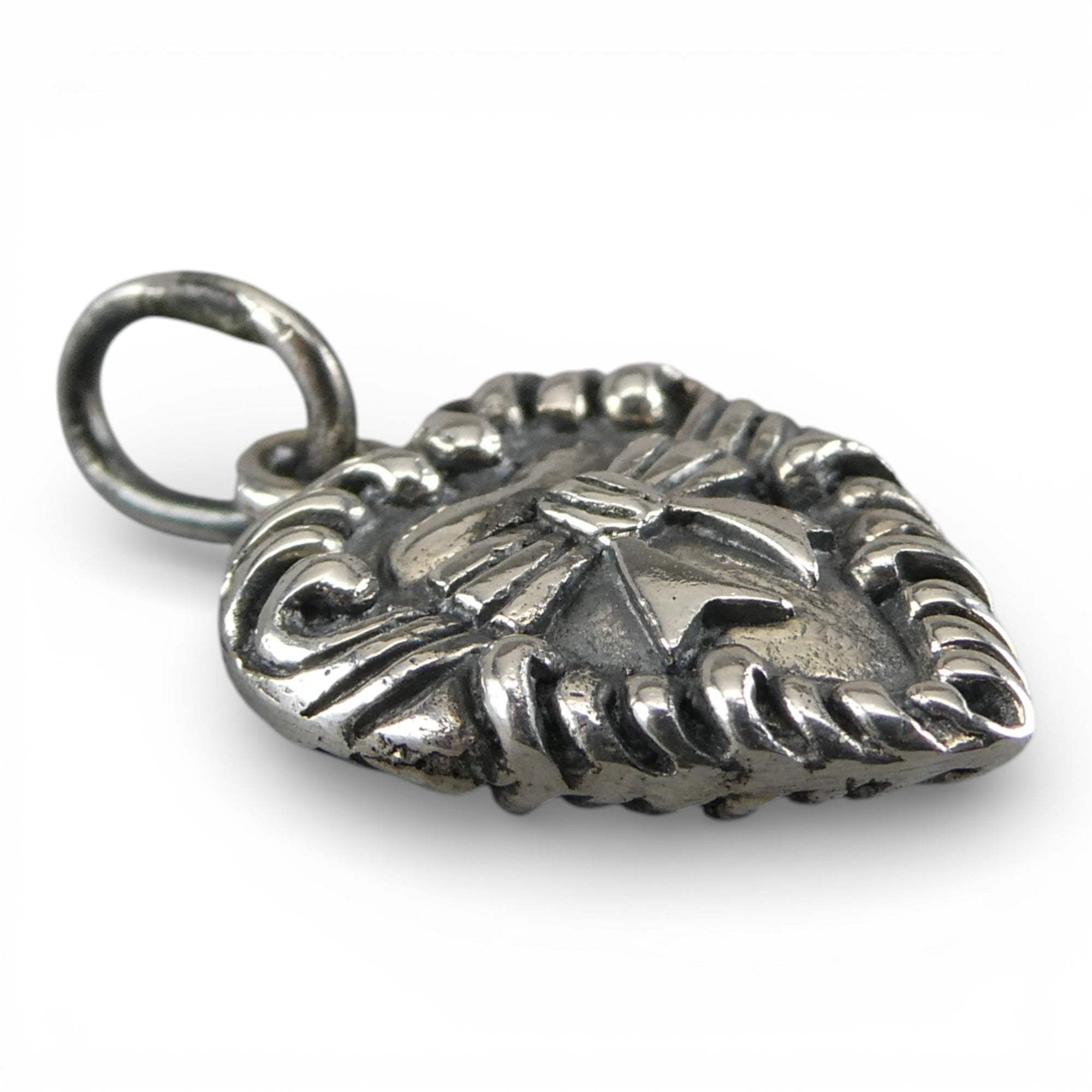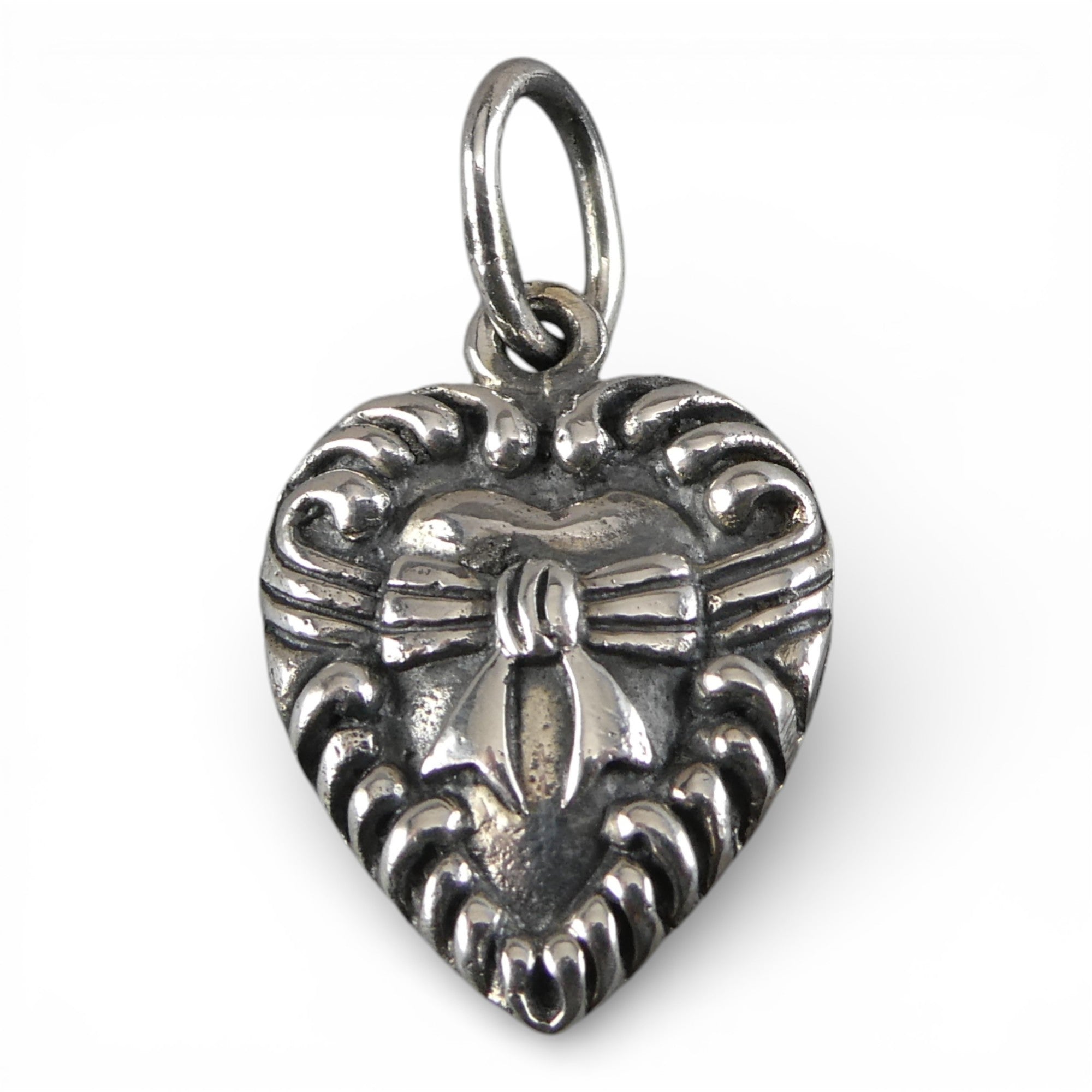 This solid, two-sided, antiqued sterling silver Victorian Bow Tie Heart charm features a fancy bow in a frame of clefs. Marked, Sterling. Made by Brown County Silver. Vintage and in new, never worn condition. Approximately 30 years old.