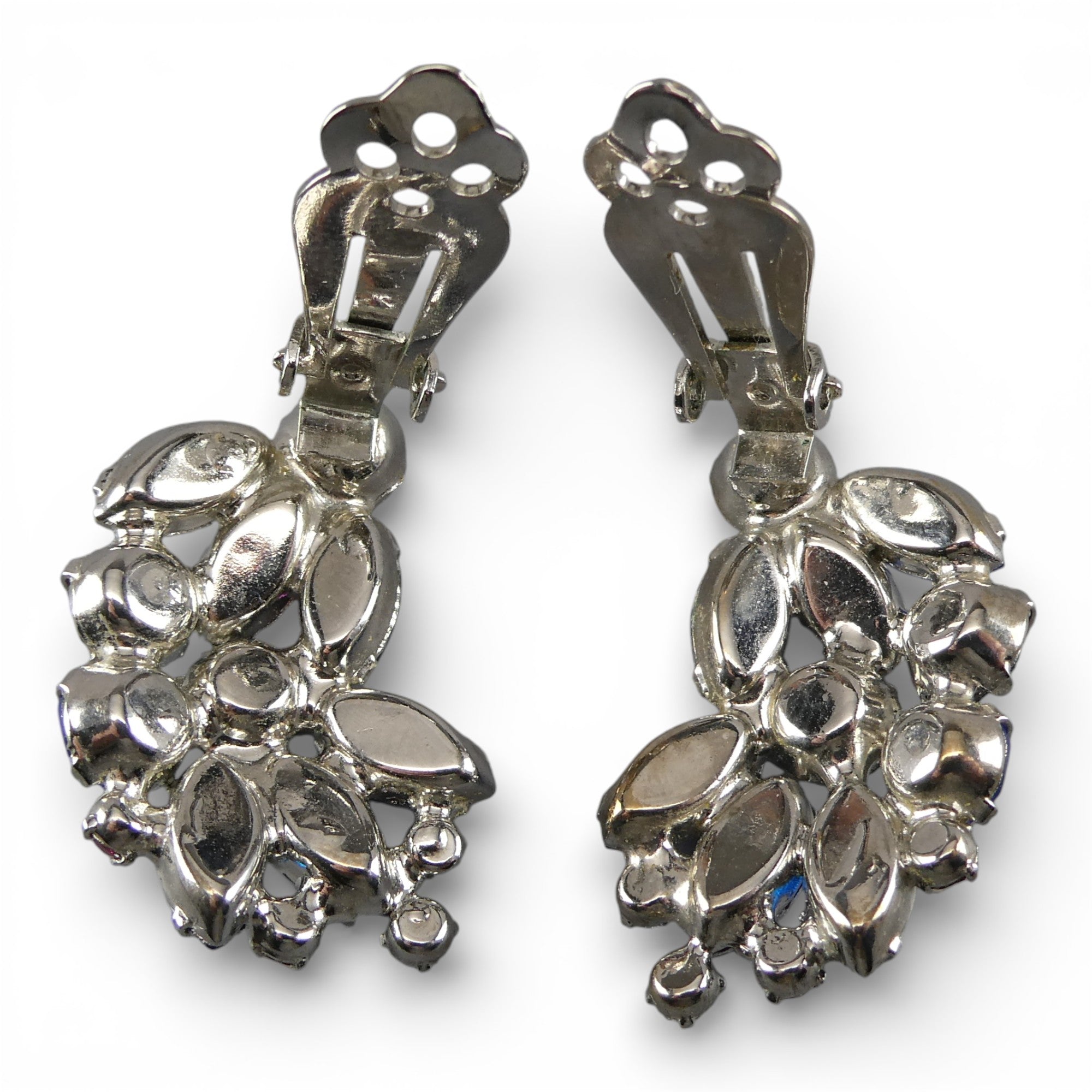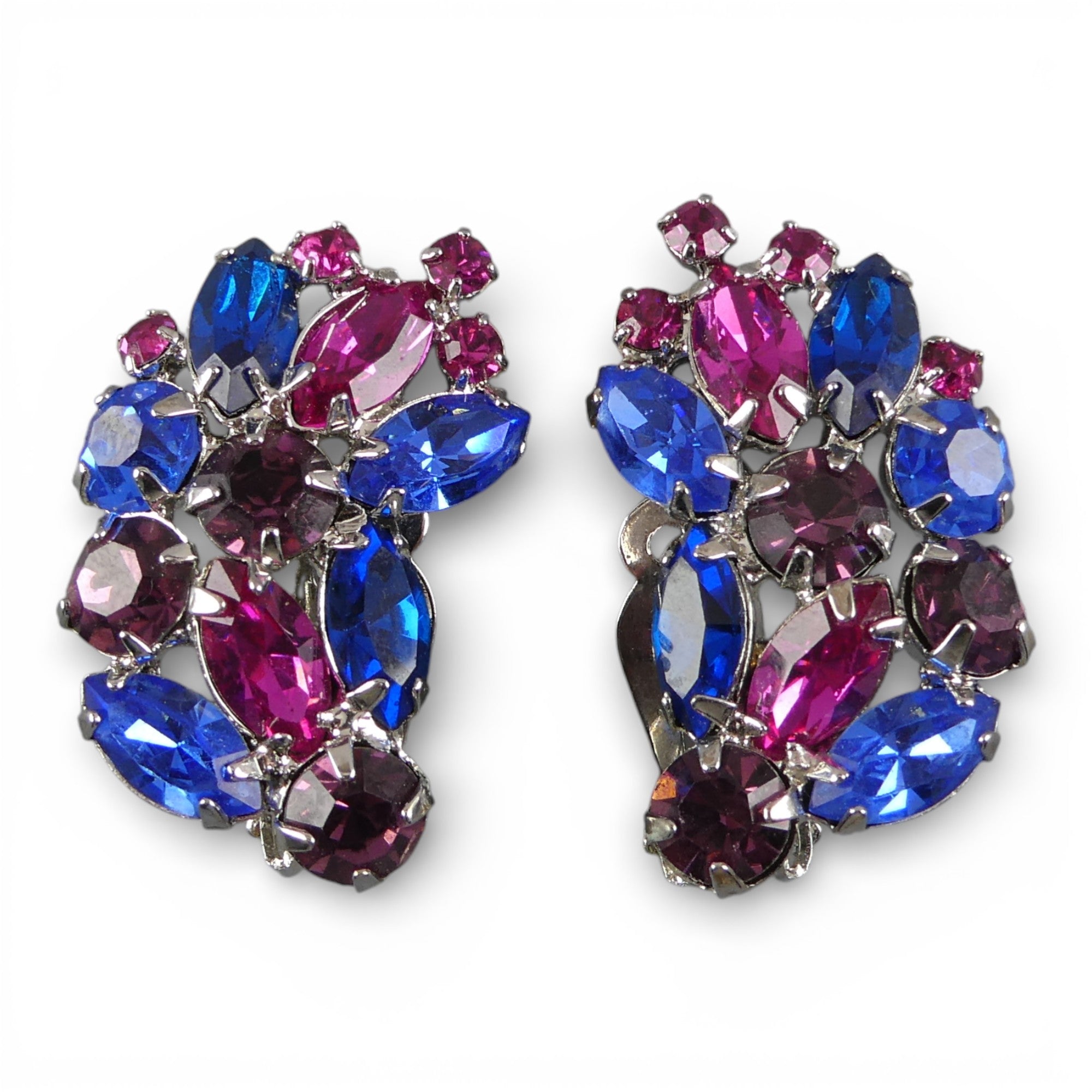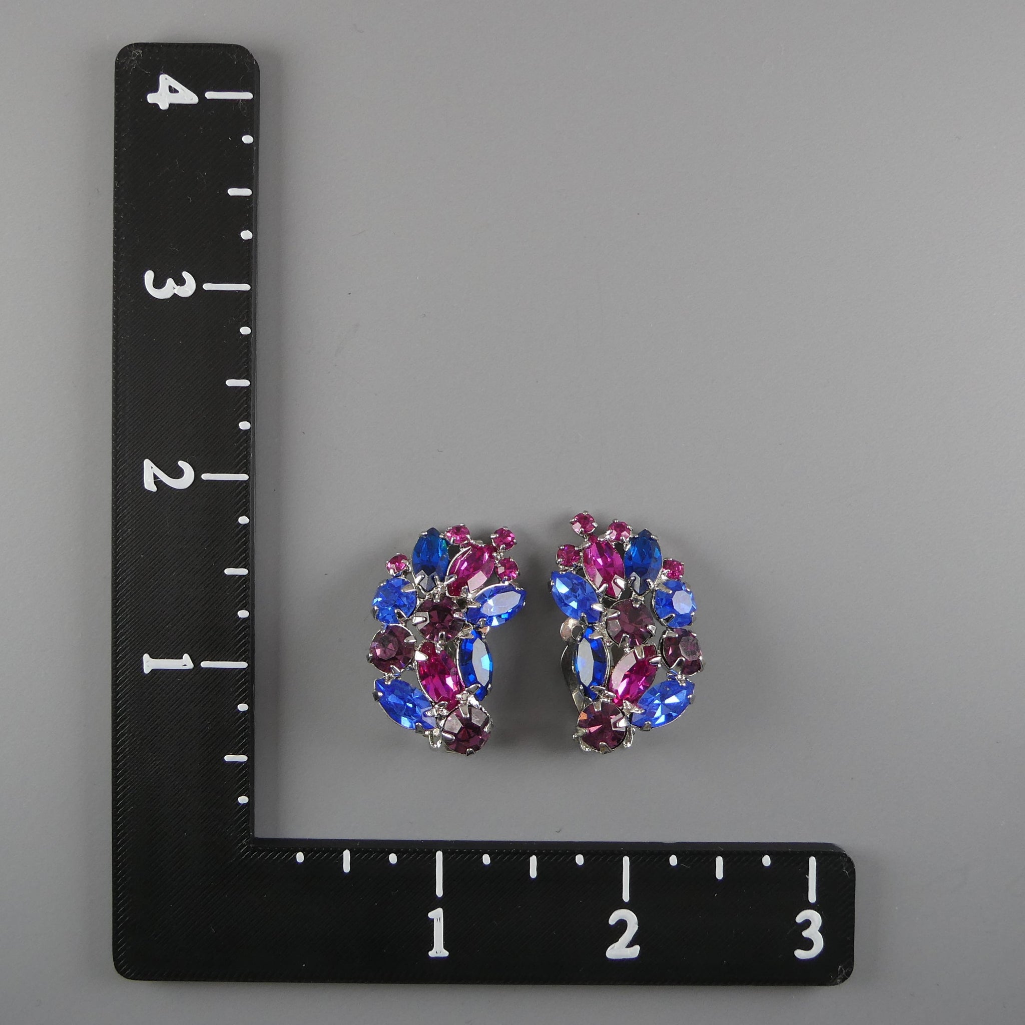 Vintage 1960s Brooch & Clip On Earrings Set w/ Blue Magenta Purple Rhinestones