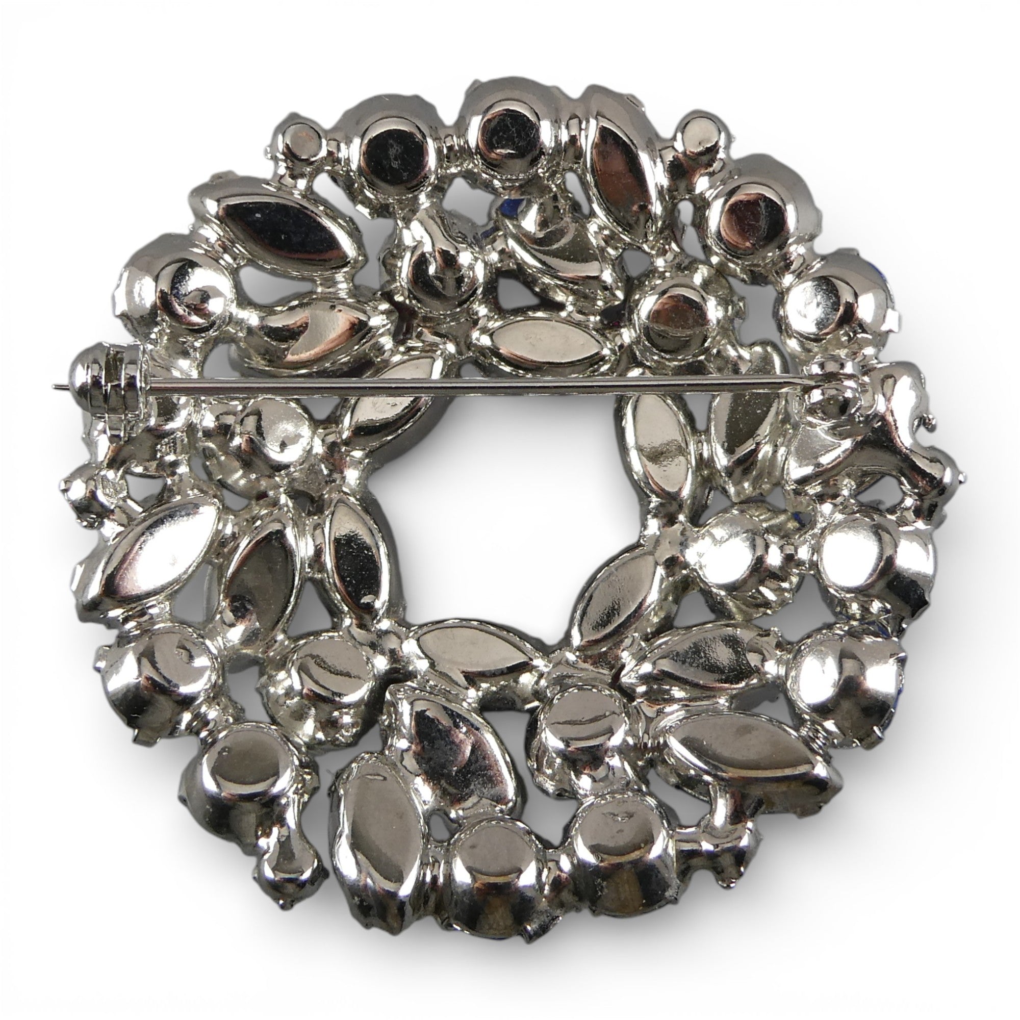 A vintage circular brooch and clip on earrings set featuring a cluster of prong-set navette and round rhinestones in shades of dark blue, purple and magenta. Mounted in silver tone metal with dog toothed prongs.