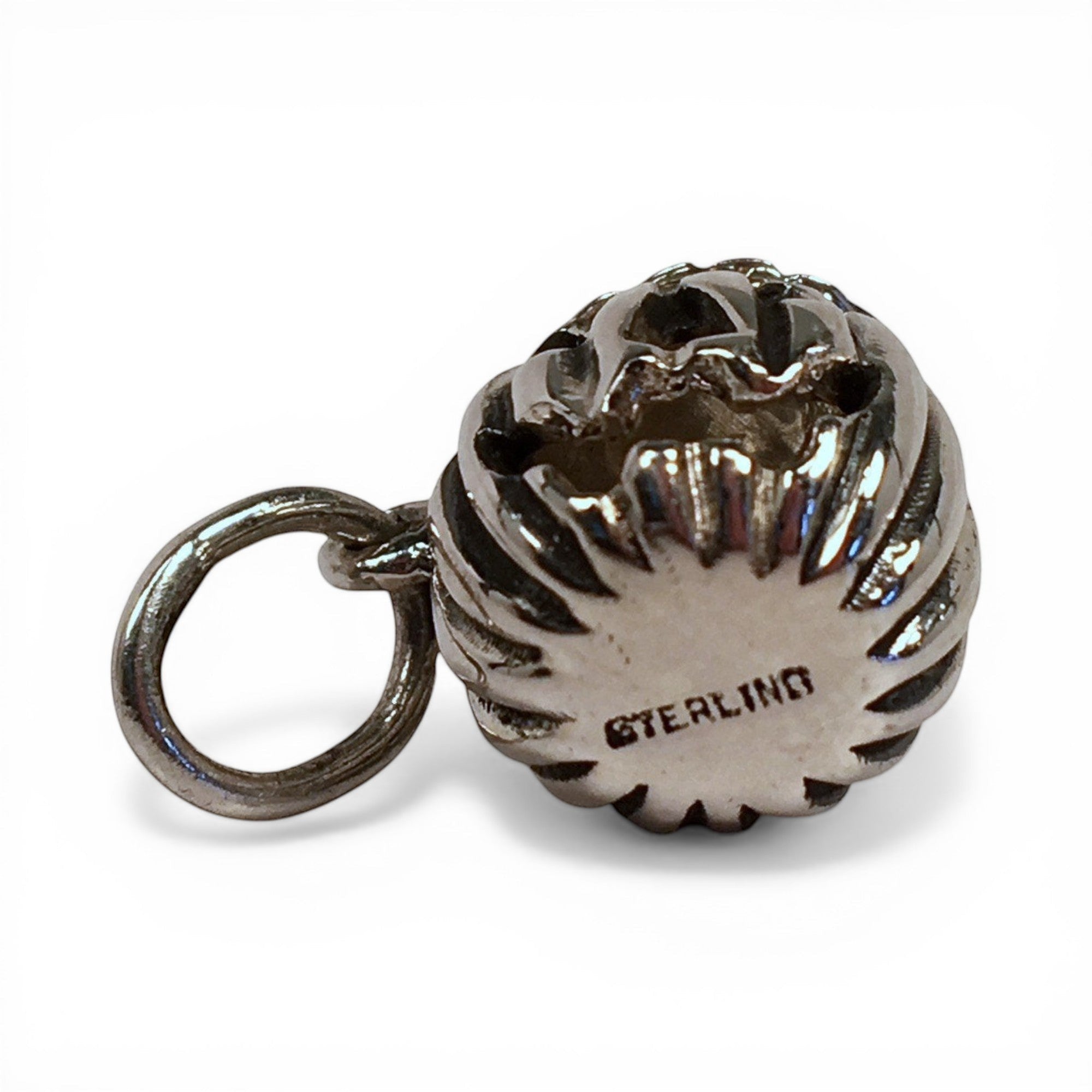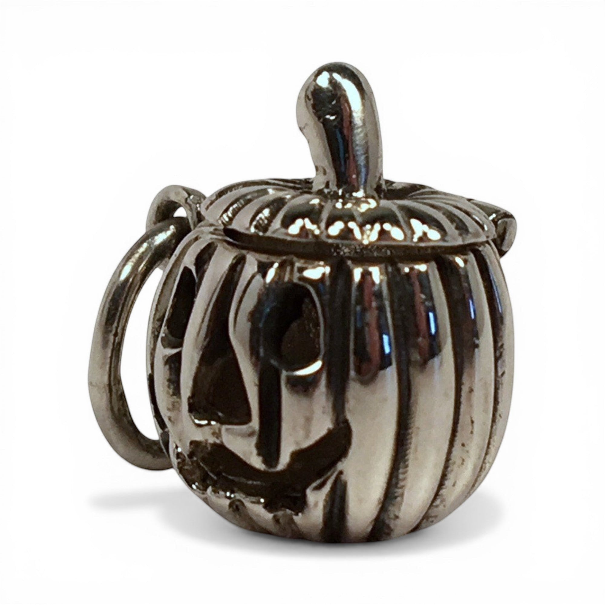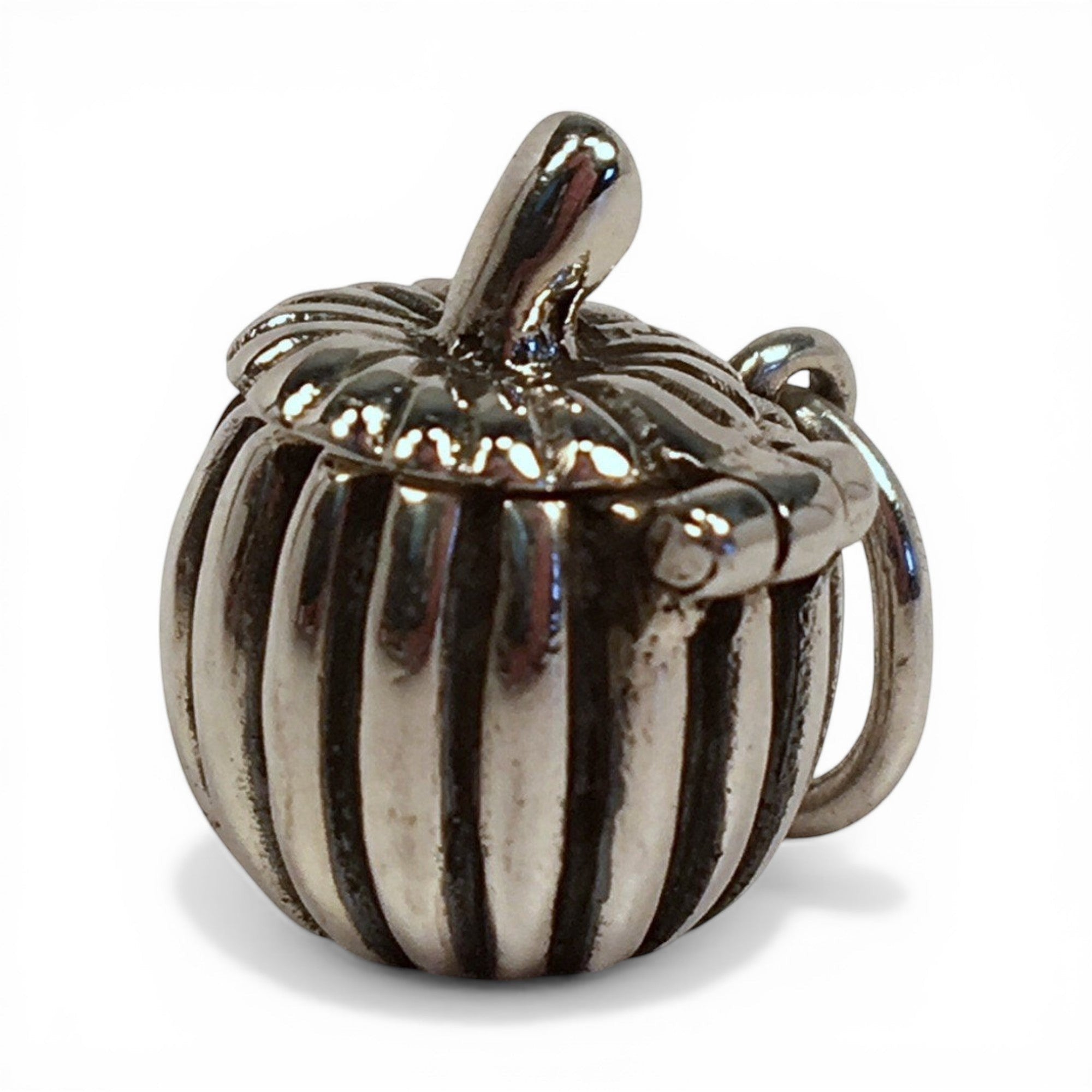 This three-dimensional, antiqued sterling silver, movable Jack-o'-Lantern charm features an authentic grooved texture. The top of the pumpkin opens. Made by Brown County Silver about 25 years ago but is in brand new condition and has never been worn. Marked sterling on the bottom.