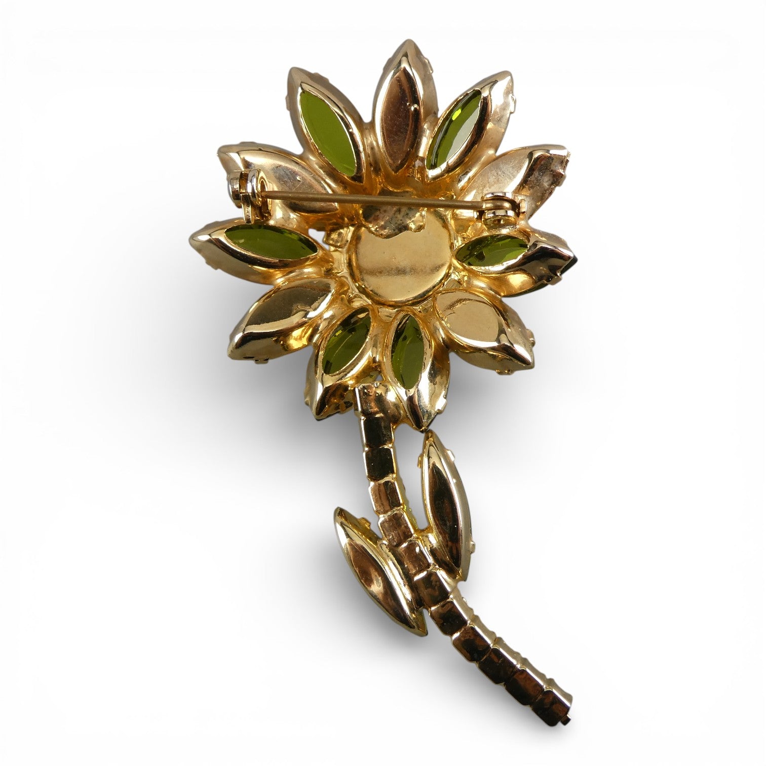 This vintage flower brooch showcases timeless elegance with its carefully arranged rhinestone petals in rich green, vibrant yellow, and lustrous black. Each stone is precisely set to capture light and create dimensional sparkle, characteristic of mid-century costume jewelry craftsmanship.