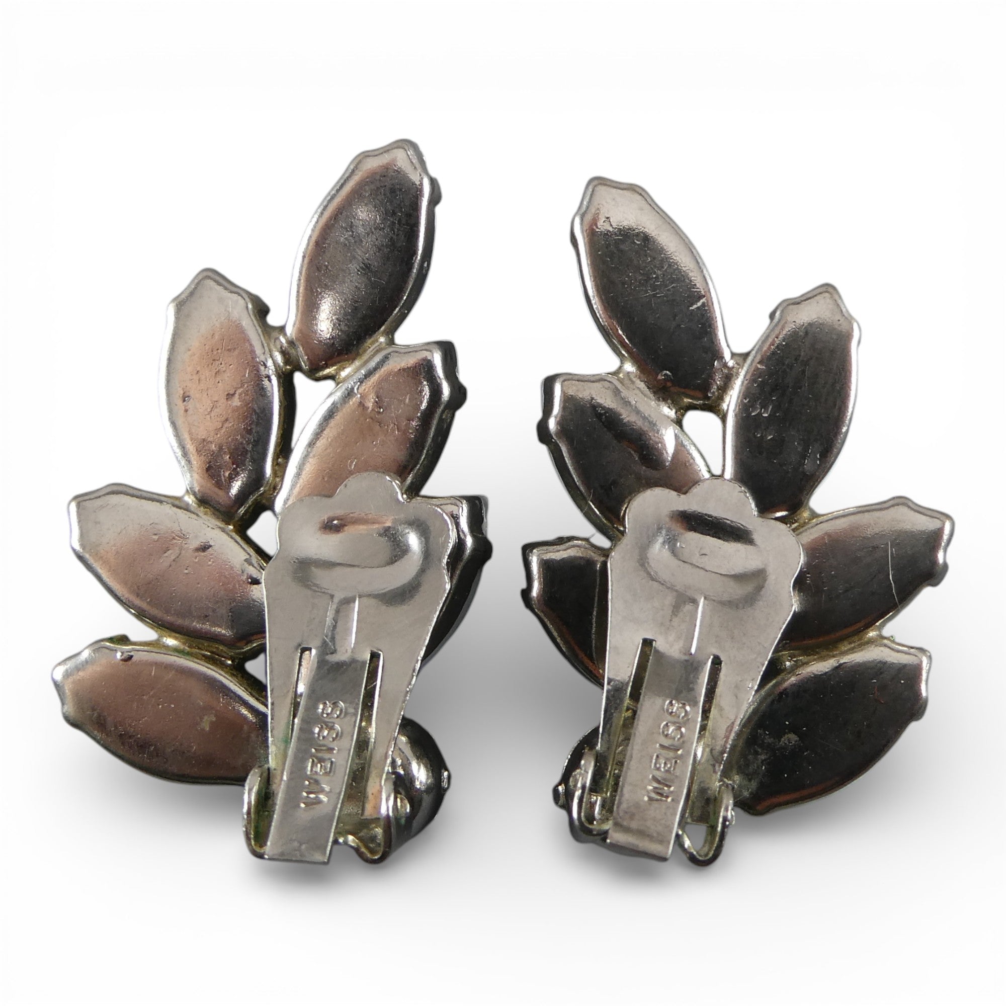 These Weiss clip-on earrings showcase powder blue milk glass paired with a sparkling round blue rhinestone. Weiss was renowned for meticulous craftsmanship and quality materials, making these pieces highly collectible.